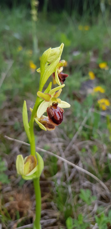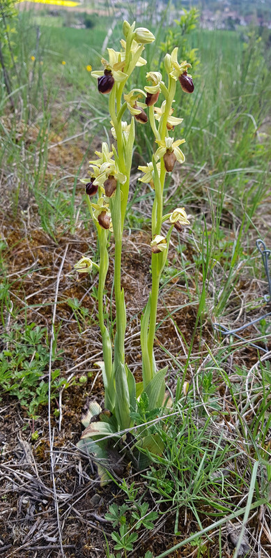 Ophrys sphegodes an einem sehr trockenen Standort vorwiegend mit Himantoglossum hircinum in unmittelbarer Nachbarschaft.