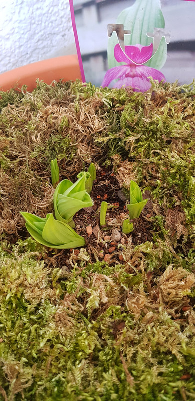 Cyp. macranthos hatte beim Pflanzen in den großen Topf unterirdisch 4 Triebe, jetzt beim Austrieb 10.